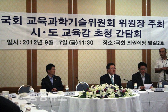 국회 교육과학기술위원회 위원장 주최 시·도교육감 초청 간담회가 7일 오전 국회 의원식당 별실2호에서 각 시·도 교육감들이 참석한 가운데 열렸다.  간담회에는 전국 17개 시·도교육감 중 광주교육감을 제외한 16명, 교과위 의원 24명, 김응권 교육과학기술부 제1차관 등이 참석했다.