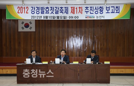 논산시(시장 황명선)는 10일 오전 시청 제1회의실에서 오는 10월 17일부터 21일까지 ‘200년 전통의 젓갈! 강경포구로의 초대...‘ 주제로 열리는 2012 강경발효젓갈축제 1차 추진상황보고회를 추진위원과 관계공무원 등이 참석한 가운데 개최했다.