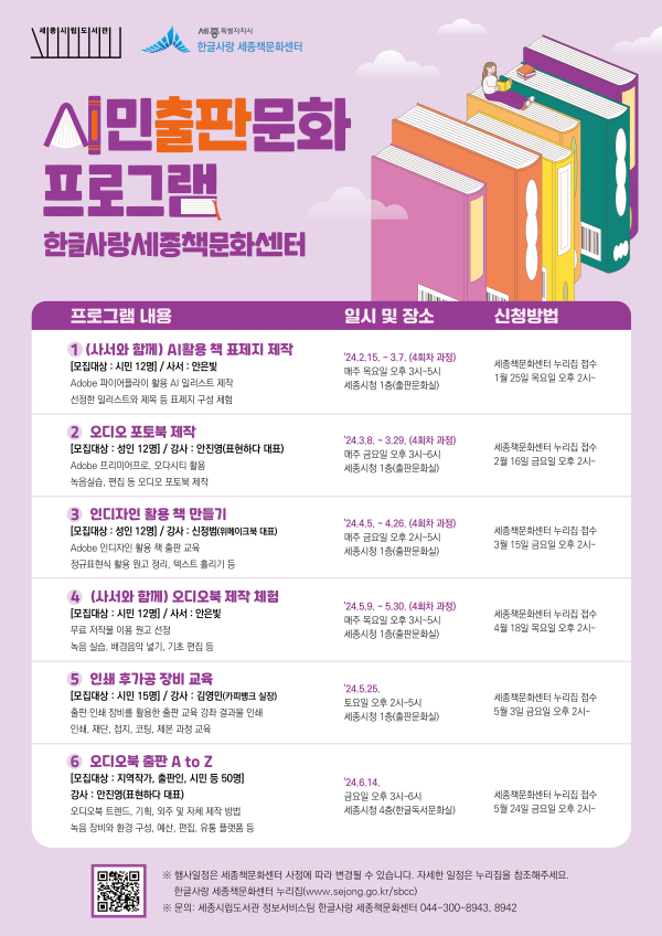 [충청뉴스 최형순 기자] 세종시립도서관 한글사랑 세종책문화센터가 지역 출판문화 확산을 위해 2024년도 상반기 출판문화강좌 수강생을 모집한다.