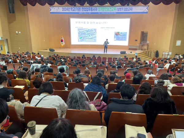 구체적인 교육내용은 ▲직종별 산업재해 현황 ▲학교(기관) 위험성평가 ▲직장내 괴롭힘(언어적 성희롱 등) ▲물질안전보건자료 ▲근골격계 및 직업병 발생 예방 등으로 사례 중심의 이론교육으로 총 6시간 진행한다.