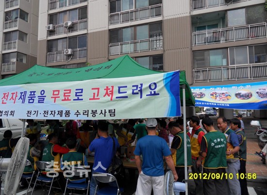 대전시 중구(구청장 박용갑)는 10일 중촌동 주공아파트 2단지 내에서 추석을 맞이하여 외롭고 경제적으로 어려운 이웃에게 전기전자제품 무료수리 봉사활동을 펼쳤다.