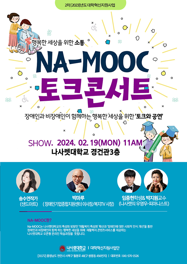 [충청뉴스 박동혁 기자] 나사렛대학교는 오는 19일 나사렛대 경건관에서 교직원, 지역주민을 대상으로 ‘장애인과 비장애인이 함께하는 세상’ 주제의 ‘NA-MOOC 토크콘서트’를 연다고 밝혔다.