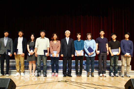 이날 오전 12시 한남대 성지관에서 열린 학생채플에서 한금태 회장은 평소 GCC운동 적극 참가자, 기독교정신 실천자, 지역사회 봉사자, 모범학생 등 10명에게 각각 1백만 원씩 총 1천만 원의 장학금을 전달했다.