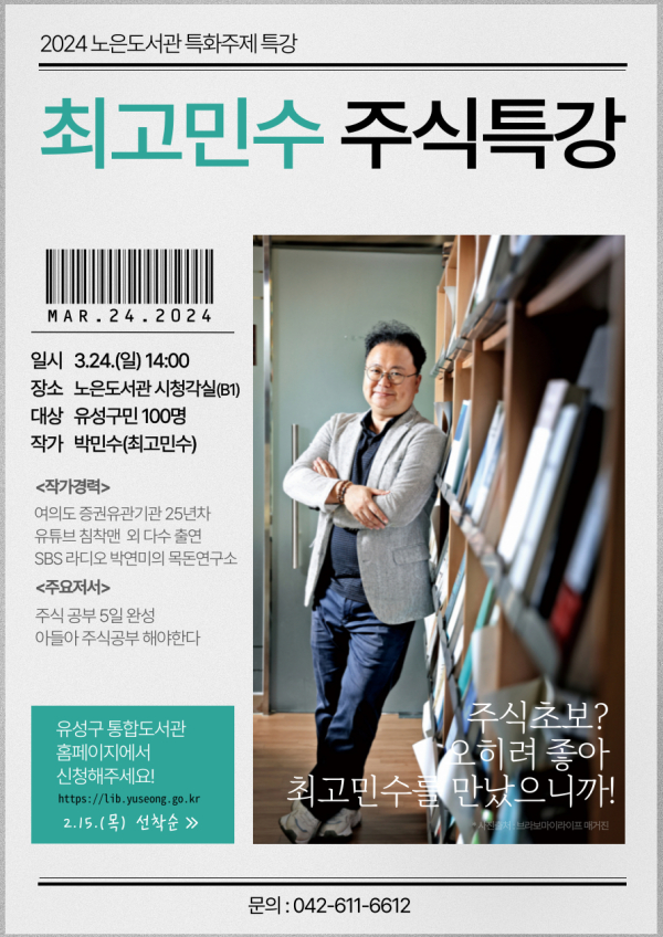 [충청뉴스 박영환 기자] 대전 유성구(구청장 정용래)는 오는 3월 24일(일) 오후 2시 노은도서관에서 유튜버이자 주식전문가인 박민수 작가(활동명: 최고민수)를 초청해 주식특강을 개최한다.