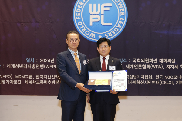 정도희 천안시의회 의장(오른쪽)은 21일 국회의원회관 대회의실에서 열린 ‘2024 WFPL 8대 지자체 혁신평가’ 의정 분야에서 대상을 받았다.