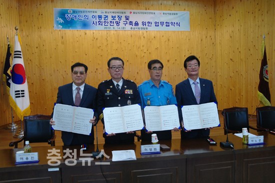 충남지방경찰청(청장 정용선)은, 14일 오전 금산경찰서 대회의실에서 충남모범운전자연합회(회장 박노경), 충남지체장애인협회(회장 이건휘), 충남시각장애인연합회(회장 황화성) 등 40여명이 참석한 가운데 '장애인 이동권 보장 및 사회안전망 구축'을 위한 업무협약을 체결했다.