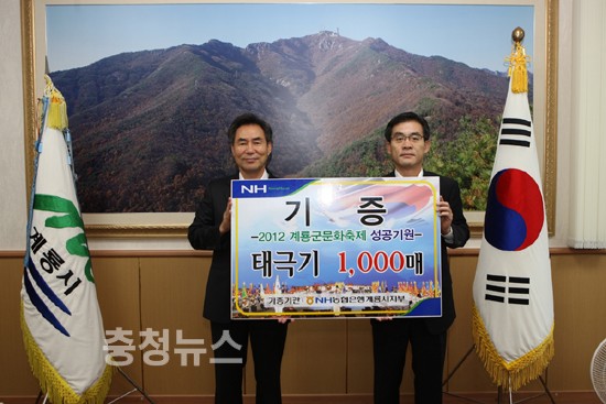 농협은행 계룡시지부(지부장 김주명)는 17일 2012계룡군문화축제 성공을 위한 태극기 1,000매(5백만원상당)를 계룡시에 기증하여 날로 희미해져가는 나라사랑에 대한 시민의식을 새롭게 하는 계기가 되어 지역민들의 훈훈한 미담이 되고 있다.