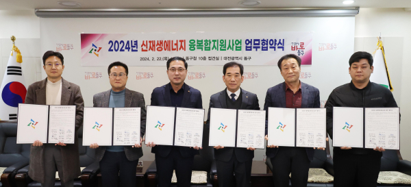 [충청뉴스 박영환 기자] 대전 동구(구청장 박희조)는 지난 22일 구청장 접견실에서 신재생에너지 보급 확산과 구민의 에너지 요금 절감을 위해 협력체 참여기업인 △건양전력 △에스케이솔라에너지 △신양에너지 △감강전기산업 △케이피에너지 대표들과 신재생에너지 융복합지원사업 업무협약을 체결했다.