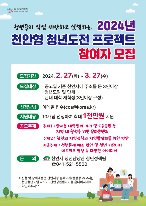 신청대상은 공고일 기준 천안시에 주소를 두고 있는 3인 이상 청년 모임·단체와 3인 이상 관내 대학생으로 구성된 모임이다.