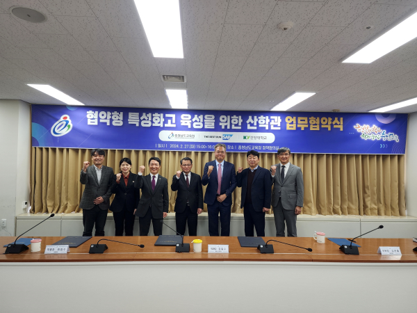 [충청뉴스 권상재 기자] 충남교육청은 27일 도교육청에서 김일수 부교육감, SAP 코리아 김준홍 부문장, 건양대학교 최임수 부총장이 참석한 가운데 글로벌 비즈니스 플랫폼 분야 인재양성과 협약형 특성화고 개교 지원을 위한 업무협약을 체결했다고 밝혔다.