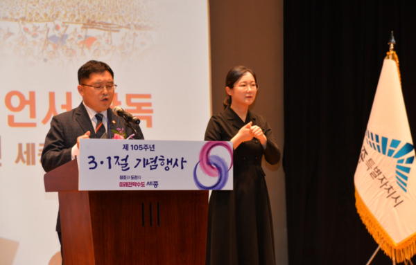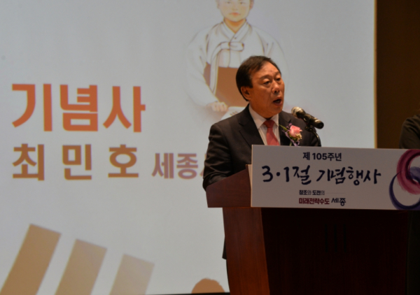 최민호 세종시장은 1일 시청 여민실에서 열린 ‘제105주년 3·1절 기념행사’에서 “국토의 중심 세종에서 높은 뜻, 넓은 시야, 깊은 사고로 새로운 대한민국을 이끌어 가겠다”고 강조했다.