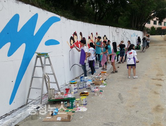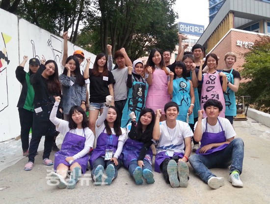 “태어난 곳은 다르지만 같은 곳에서 공부하는 외국인 유학생들과 소중한 추억을 만들 수 있는 일이 무엇이 있을까 생각하던 중에 함께 캠퍼스의 건물에 벽화를 그려보면 좋겠다는 생각을 했습니다” 이번 프로젝트를 기획한 ‘핫한남녀(핫한 한남대학교 남학생과 여학생)’의 팀장인 성지민(경영학과 3년) 씨의 설명이다.