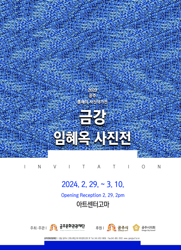 ‘올해의 사진 작가전’은 공주지역의 역량 있는 중견 사진작가를 선정하여 작품 전시를 지원함으로써 창작 의욕 고취 및 지역 문화예술 활성화를 도모하는 사업이다. 오는 10일까지 ‘임혜옥 <금강>전’을 아트센터고마에서 개최한다.