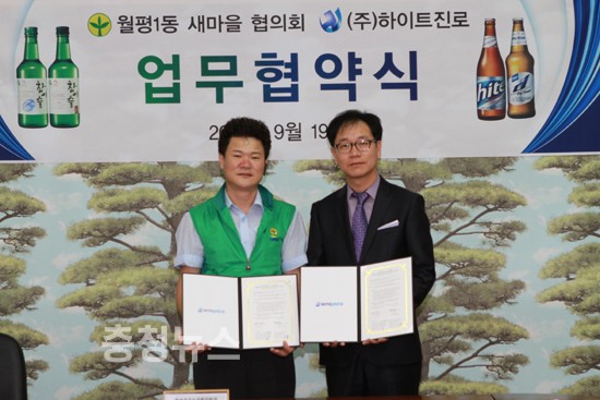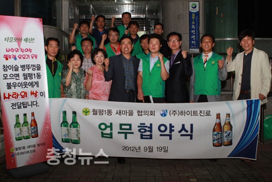 하이트진로(지점장 오양균)는 19일 월평1동 주민센터회의실에서 송용석 월평1동 새마을협의회장 및 회원과 월평1동 자생단체장들이 참석한 가운데 ‘사랑의 참이슬 병뚜껑 모으기 협약식’을 가졌다.