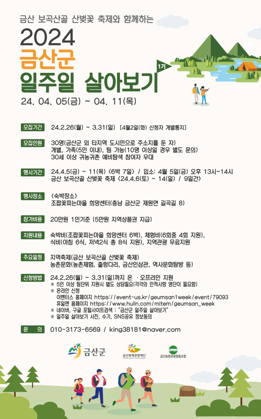 2024년 금산군 일주일 살기 프로그램에 관한 자세한 내용은 모집 담당자(☎010-3173-6569)에게 문의하면 된다.