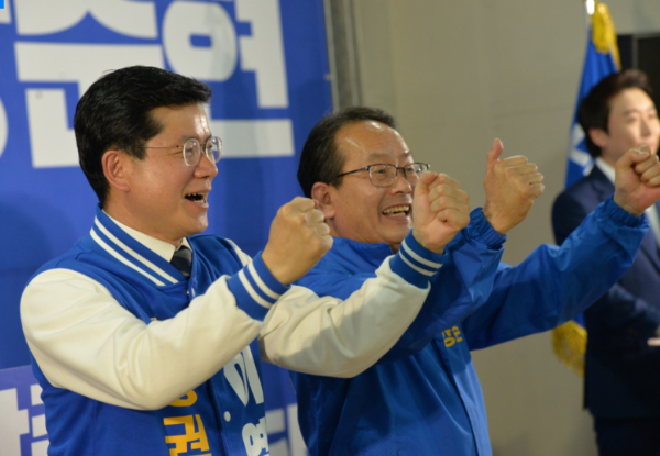 파이팅 하는 이영선 후보와 강준현 후보