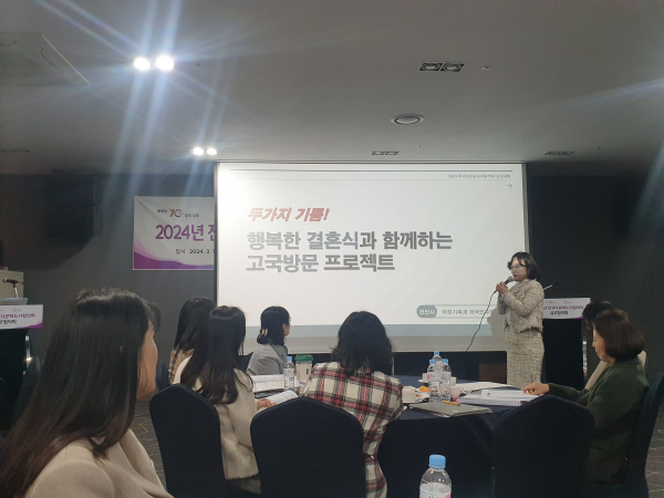 박경미 천안시 여성가족과장이 ‘두 가지 기쁨! 행복한 결혼식과 함께하는 고국 방문 프로젝트’를 설명하고 있다/천안시 제공