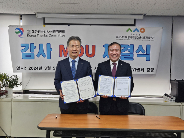 [충청뉴스 권상재 기자] 충청남도여성가족청소년사회서비스원은 사단법인 대한민국국민감사위원회와 지난 5일 대한민국국민감사위원회에서 충남도내 청소년의 올바른 인성함양을 위해 상호 협력하기 위한 업무협약을 체결했다고 밝혔다.