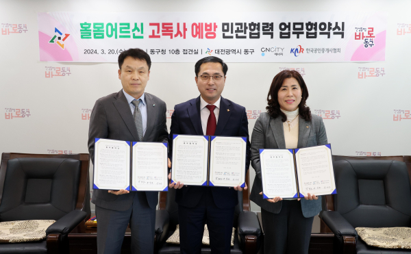 [충청뉴스 박영환 기자] 대전 동구(구청장 박희조)는 20일 구청장 접견실에서 CNCITY 에너지(대표이사 송상호), 한국공인중개사협회 대전동구지회(지회장 송미선)와 홀몸어르신 고독사 예방을 위한 민관 업무협약을 체결했다.