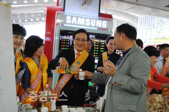 ▲ 황인방 총재가 귀성객들에게 한과와 음료를 대접해 제공하는 봉사활동을 펼쳤다.