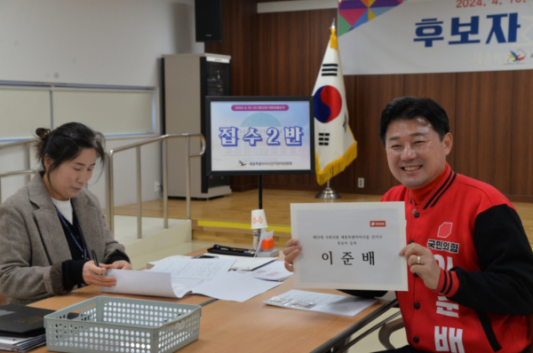 [충청뉴스 최형순 기자] 제22대 4.10 총선 후보 등록 첫날 21일 세종 을에 출마한 국민의 힘 이준배 후보가 첫번째로 세종시선거관리위원회에 후보 등록을 마쳤다.