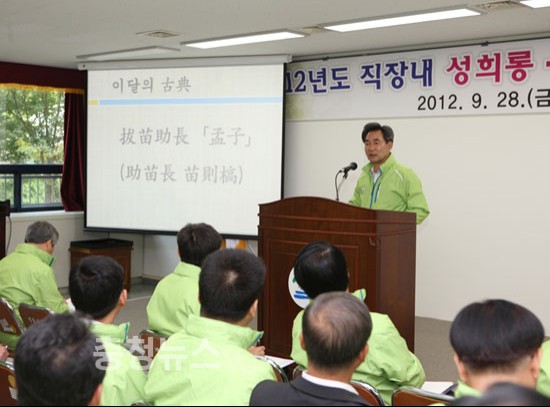 이기원 시장은 직원모임을 마치면서 이달의 고전으로 맹자의 구절 중 “拔苗助長(발묘조장) 助苗長 苗則槁(조묘장 묘즉고)” “억지로 싹을 나게 도와주는 것은, 오히려 싹을 마르게 하고 일을 망치게 한다”라고 소개하면서 “모든 일에는 순리가 있으며 그 순리를 거슬러 억지로 조급하게 일을 처리하지 말고 때로는 스스로 일어날 수 있도록 지켜봐 주는 것도 아름답다”고 말했다.