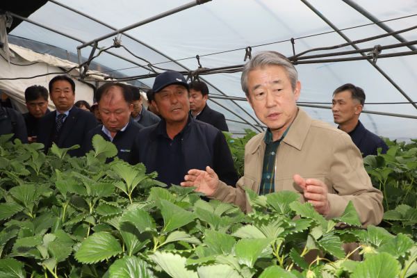 강호동 농협중앙회장(오른쪽)이 부여군 일조량 부족 피해 딸기 재배농가를 찾아 현장의 의견을 듣고 있다.