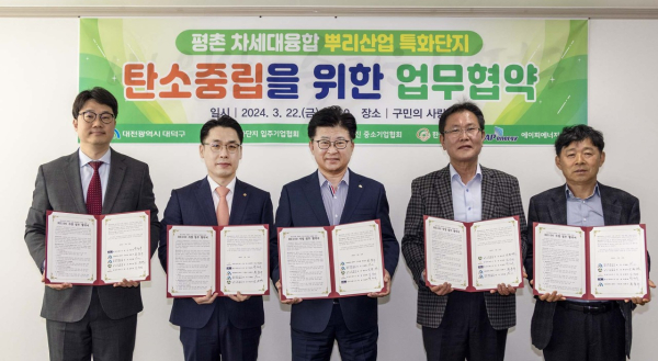 [충청뉴스 박영환 기자] 대전 대덕구(구청장 최충규)는 ‘평촌 차세대 융합 뿌리산업특화단지’ 입주기업의 경쟁력을 높이고 탄소중립 실현을 위한 업무협약(MOU)을 체결했다고 밝혔다.