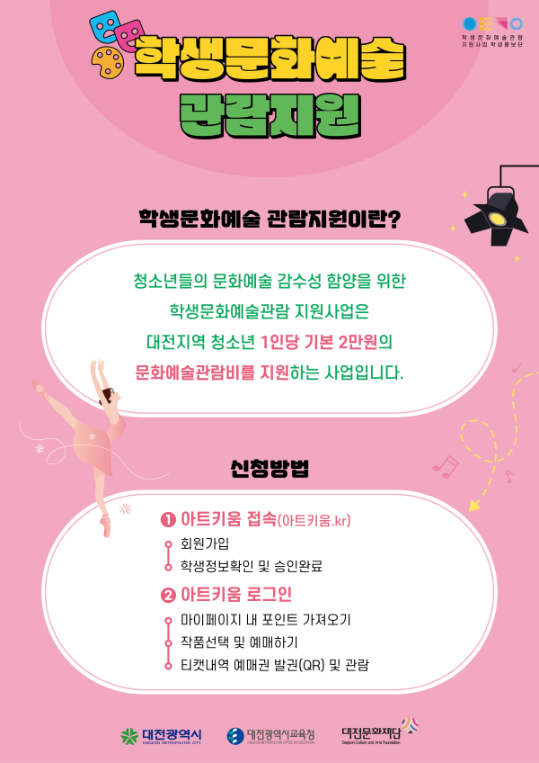 [충청뉴스 박영환 기자] 대전문화재단(대표이사 백춘희)이 대전의 청소년을 대상으로 문화예술작품 관람비를 지원하고, 지역 내 문화예술 소비와 참여를 증진하는 「2024년 학생문화예술관람 지원사업」을 본격 시작한다고 전했다..