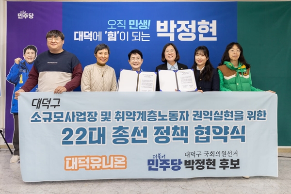 이에 박정현 후보는 “대덕구청장 시절 플랫폼노동자 등 취약계층 노동자의 노동환경 개선 등에 관심이 많아 관련 정책을 펼쳐왔다”며 “이번 총선에서 반드시 승리해 윤석열 정부의 퇴행하는 노동정책을 막고 특수고용 노동자 및 비정규 노동자를 위한 정책을 펼치겠다”고 강조했다.