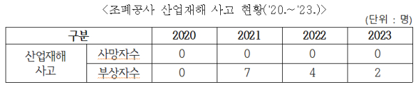 한편, 조폐공사는 안전보건경영체계 확립 및 안전문화 확산을 통해 매년 산업재해 수를 감축시키고 있다. 현재 각 본부 무재해 일수는 제지본부가 487일, ID본부가 1,070일에 달한다. 기술연구원은 무려 1,604일 동안 무재해 중이다. 이런 노력으로 최근 5년 내에 산업재해로 인한 사망자는 없을 뿐만 아니라, 부상자 수도 ΄21년 7명에서 ΄23년 2명으로 매년 지속 감소 추세이다.