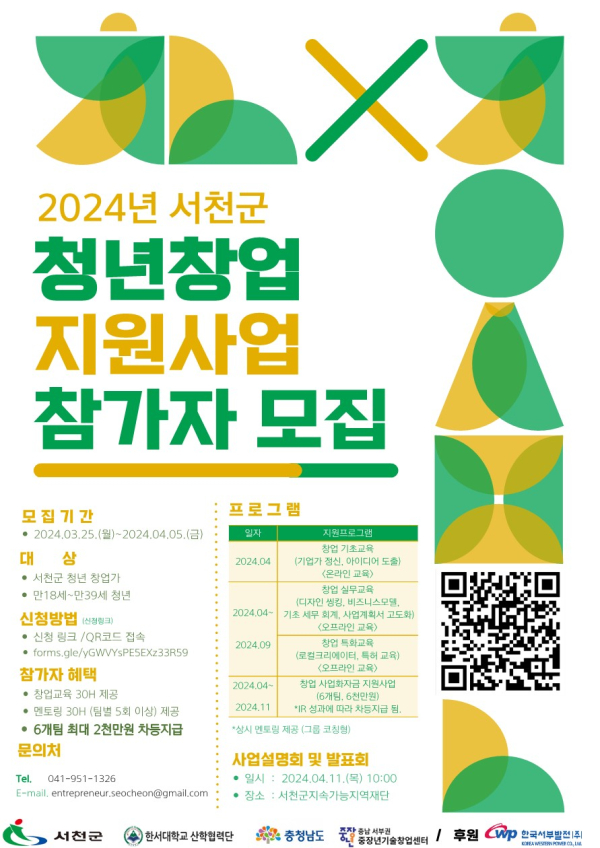군 관계자는 “성공적인 청년 창업자를 육성하여 서천의 지역 브랜드가치를 높이고 인구소멸의 위기를 극복하길 기대한다”며, “이번 기회에 체계적인 준비를 통해 창업에 도전해보길 바란다”고 밝혔다.