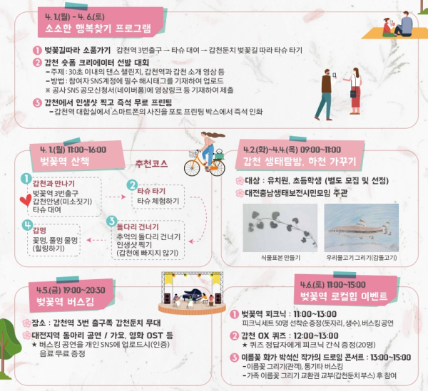 또한, 4월5일~6일에 갑천 둔치에 설치되는 무대에서는 △이름꽃화가 박석신의 드로잉 콘서트, △벚꽃역 버스킹, △가족 피크닉, △갑천OX퀴즈 컨테스트 등 남녀노소 모두가 즐길 수 있는 프로그램이 예정되어 있다.