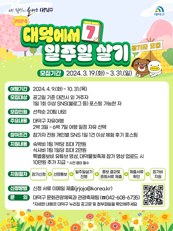 [충청뉴스 박영환 기자] 대전 대덕구(구청장 최충규)는 오는 31일까지 ‘2024 대덕에서 일주일 살기’ 참가자를 모집한다고 밝혔다.