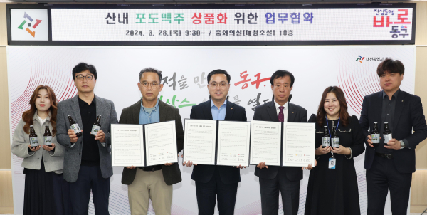 [충청뉴스 박영환 기자] 대전 동구(구청장 박희조)는 산내 포도맥주 상품화를 위해 산내농협(조합장 송경영) ㈜금강브루어리(대표 임성빈)와 업무협약을 체결했다고 28일 밝혔다.