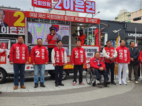 오늘 합동유세에는 이은권(중구), 이상민(유성구을), 조수연(서구갑), 양홍규(서구을), 윤소식(유성구갑), 박경호(대덕구) 후보와 유대혁 유성구의원 후보을 비롯한 당원과 시민 1,000여 명이 참석해 지지를 호소했다.