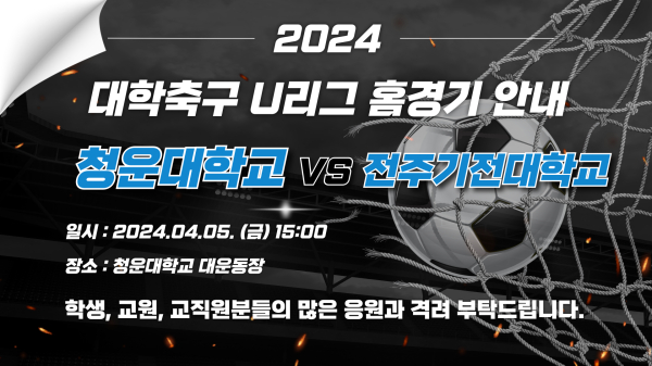 청운대 홈경기 개막전은 오는 5일 15시에 청운대학교 대운동장에서 펼쳐지며, 지역주민 또는 축구에 관심있는 분들은 누구나 무료로 관람이 가능하다.