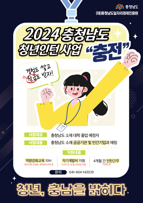 충청남도 청년인턴 사업 ‘충전’은 공공기관·민간기업 80개사 이상 모집하고, 도내 대학 우수 인재를 추천받아 매칭한 뒤 60명의 청년이 9월부터 12월까지 4개월간의 인턴 근무를 실시한다.