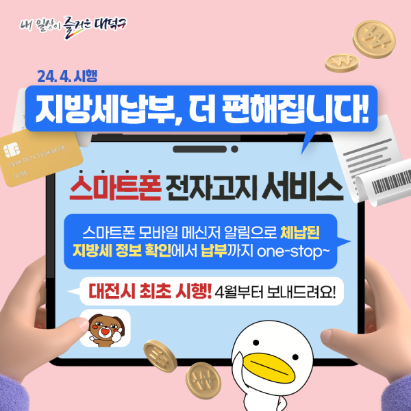 최충규 대덕구청장은 “모바일 전자고지 서비스를 통해 예산과 자원을 절감은 물론, 체납액 징수에도 큰 도움을 줄 것으로 기대하고 있다”라며 “앞으로도 더 쉽고 편리한 납세자 맞춤형 세무행정 서비스를 제공할 수 있도록 최선을 다하겠다”라고 말했다.