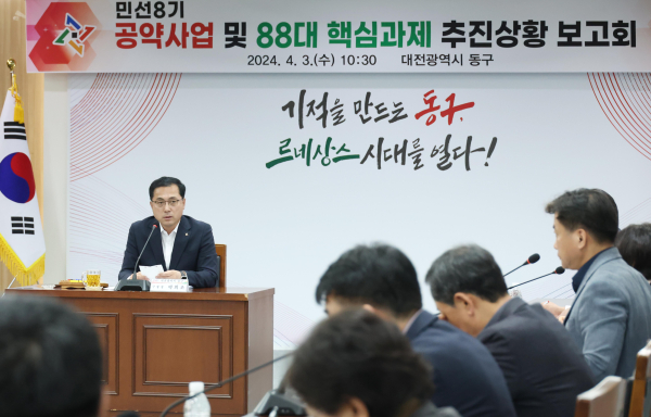 [충청뉴스 박영환 기자] 대전 동구(구청장 박희조)는 3일 구청 대회의실에서 박희조 동구청장 주재로 ‘민선 8기 공약사업 및 핵심과제 추진 상황 보고회’를 개최하고, 주요 사업을 면밀히 점검했다고 전했다.
