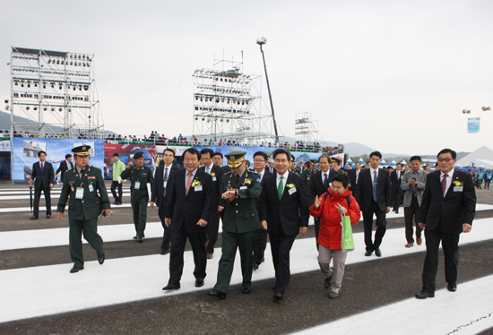 ▲ 염홍철 대전시장과 이기원 계룡시장 및 관계자들이 군문화축제 행사장을 관람하고 있다.