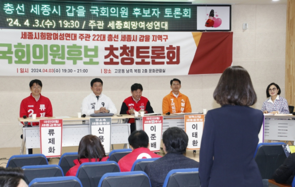 세종시 희망여성연대(대표 박희숙)는 3일 고운동 남측 복컴 2층 문화관람실에서 ‘제22대 국회의원선거 세종시 갑을 지역구 후보자 초청 토론회’를 개최했다고 밝혔다.