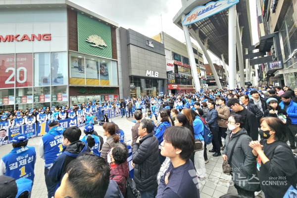 [충청뉴스 박영환 기자] 이재명 더불어민주당 대표가 5일 오전 사전투표를 마친 뒤 대전 중구 으능정이 거리에서 총선 지원유세에 나섰다.