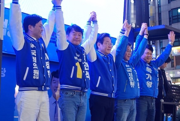 후보들은 이날 천안종합터미널 앞에서 진행된 이재명 민주당 대표의 지원 유세에 참여해 정권 교체를 위한 시민들의 투표 참여를 호소했다.