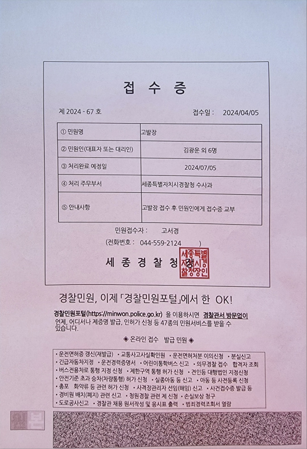 국민의힘 김광운 세종시의원을 비롯한 6명은 5일 세종시경찰청 수사과에 “악질적이고 파렴치한 유튜브 세력과 함께 벌이는 정치공작’, ‘더욱이 세종시민을 대표하여 최소한의 품위를 지켜야 할 시의원들이 정치공작에 함께 가담”이라고 발언한 “민주당 의원들을 의회 협치 파트너인 상대당의 의원들의 명예를 실추시켰다”라며 고발장을 접수했다.