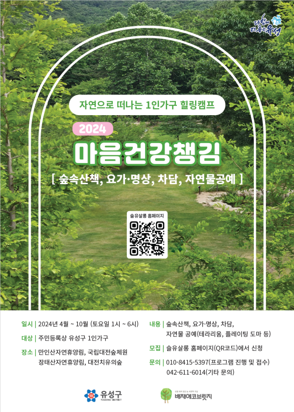[충청뉴스 박영환 기자] 대전 유성구(구청장 정용래)가 4월부터 10월까지 1인가구 숲속 힐링캠프 「마음건강챙김」사업을 추진한다.