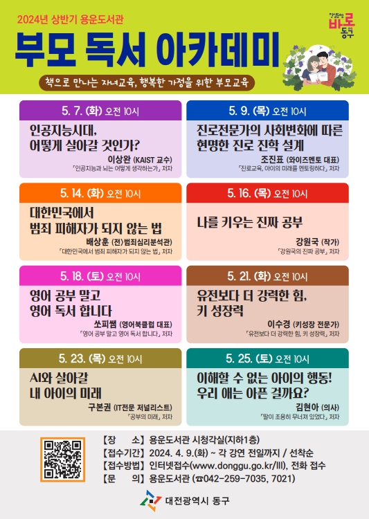 [충청뉴스 박영환 기자] 대전 동구(구청장 박희조)는 부모 교육 전문 강사를 초청해 5월 한 달간 총 8회에 걸쳐 ‘2024년 상반기 부모 독서 아카데미’를 개최한다고 8일 밝혔다.