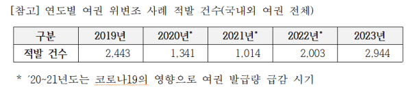 우리나라를 방문하는 외국인이 증가함에 따라 여권 위‧변조 사례도 증가 추세다. 2021년 1,014건에서 점차 증가하여 2022년 2,003건, 2023년 2,944건에 달하지만, 보안이 강화된 현용 차세대 전자여권에 대한 위‧변조 사례는 아직 발견되지 않았다고 법무부 관계자는 전했다.