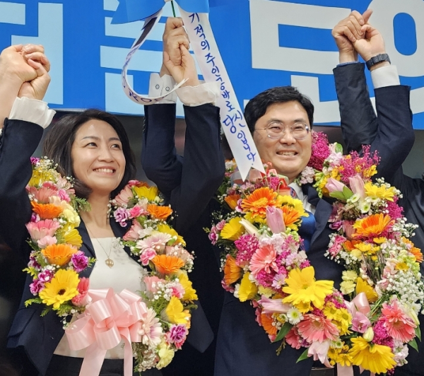 이정문 당선인(오른쪽)이 선거사무소에서 배우자와 당선 세리머니를 하고 있다./사진=박동혁 기자