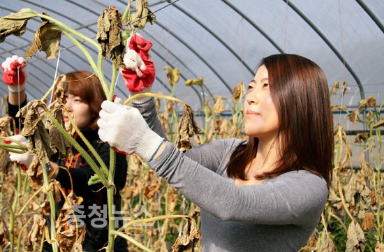 농활에 참석한 충발연 임직원 60여명은 이곳 마을주민과 함께 지난 태풍으로 쓰러진 비닐하우스의 철거와 보수, 수확이 끝난 비닐하우스 작물과 비닐 제거작업 등을 하며 하루종일 구슬땀을 흘렸다.